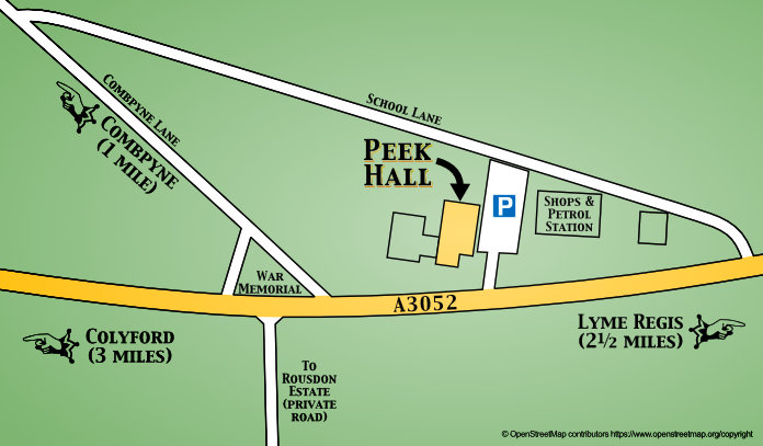 The village of Rousdon is situated on the A3052 between Lyme Regis and Colyford. Our postal address is Peek Hall, Combpyne & Rousdon Village Hall, Rousdon, Lyme Regis, Dorset DT7 3XW. The map below shows where to find us. You can also find us on Google Maps, OpenStreetMap and what3words (///slice.rejoins.tumble).